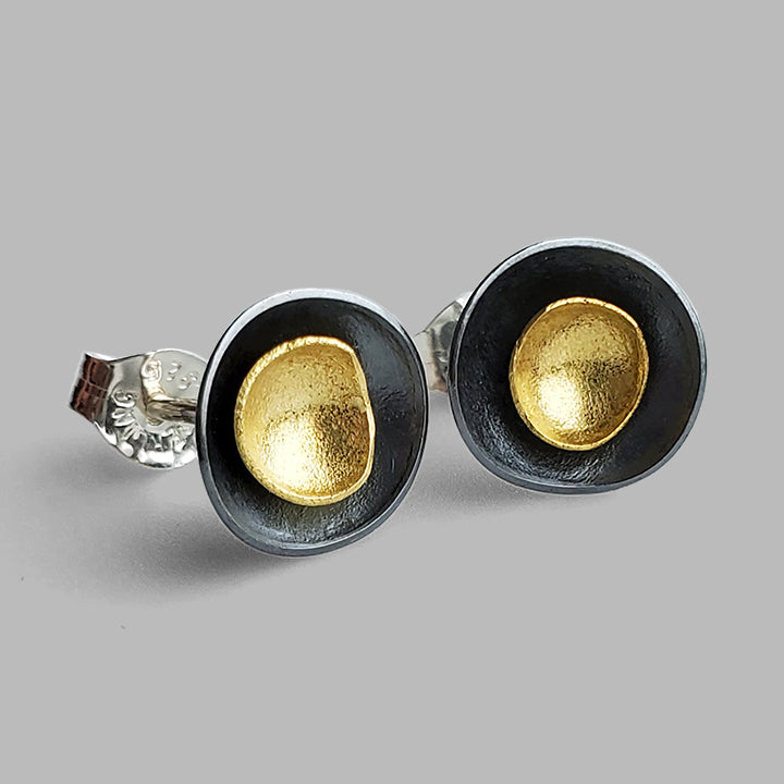Handmade in sterling silver with 18k yellow gold cups and finished in a dark patina.