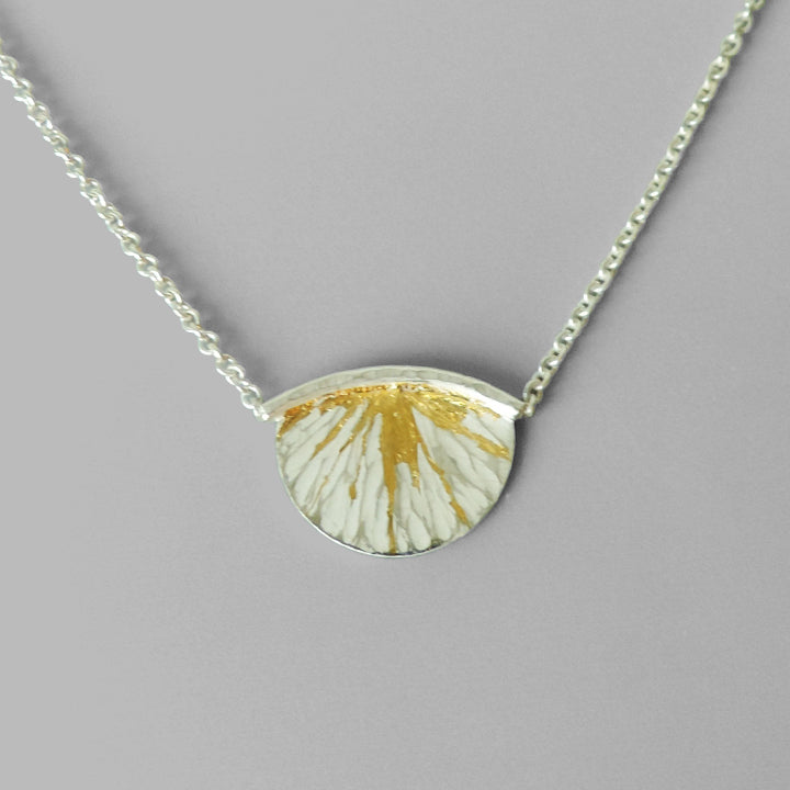 Hand made of sterling silver and 24k gold keum boo. Chain measures 17″ long