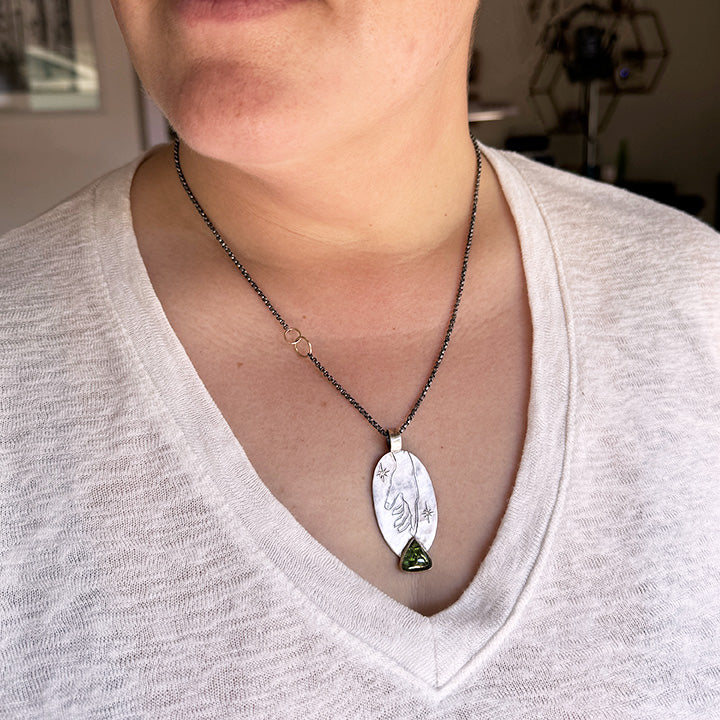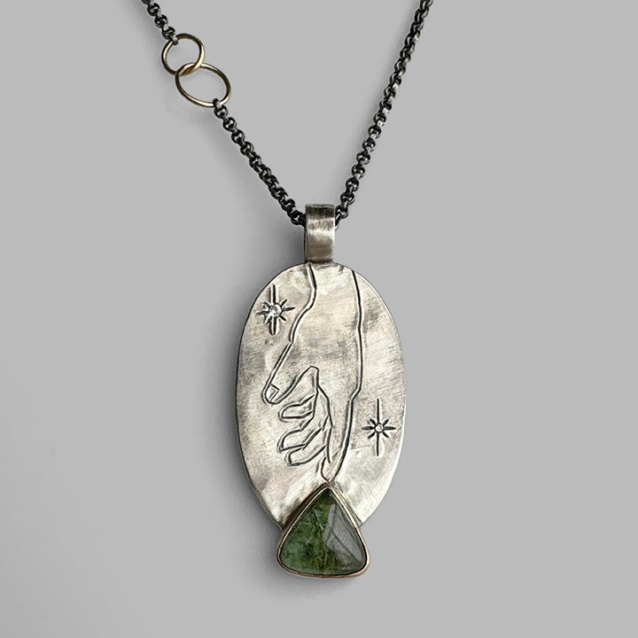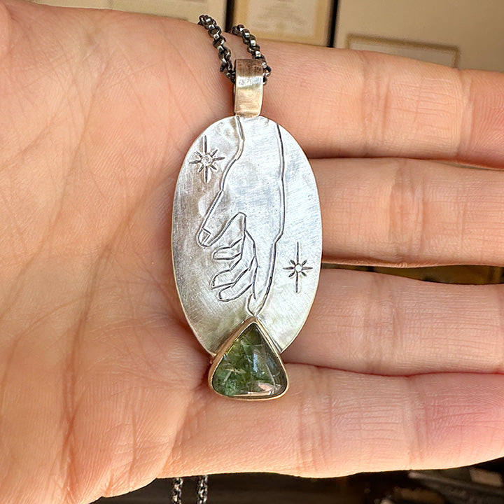 Handmade from sterling silver with a blue green tourmaline set in 14k gold and diamonds set in the pedant itself. the chain also contains small 14k gold hoops. Brushed oxidized finish.