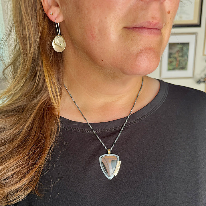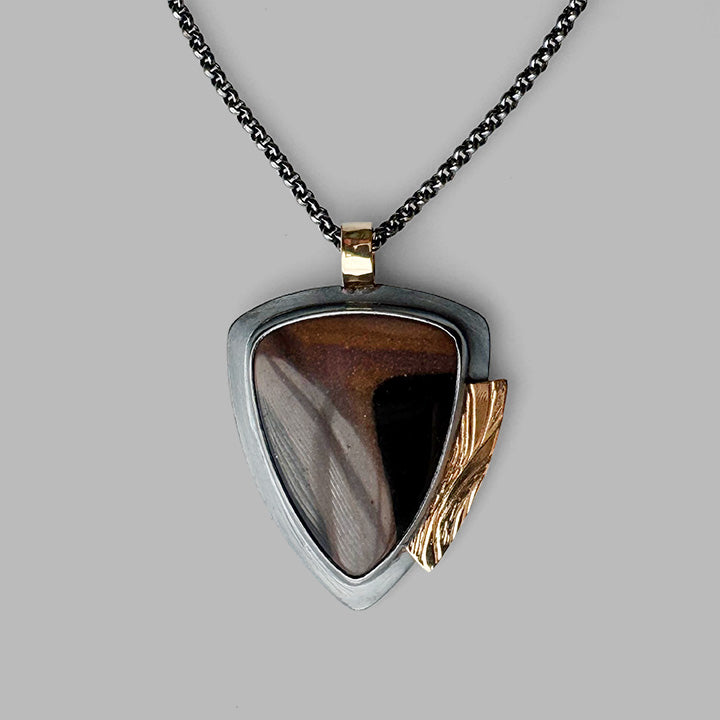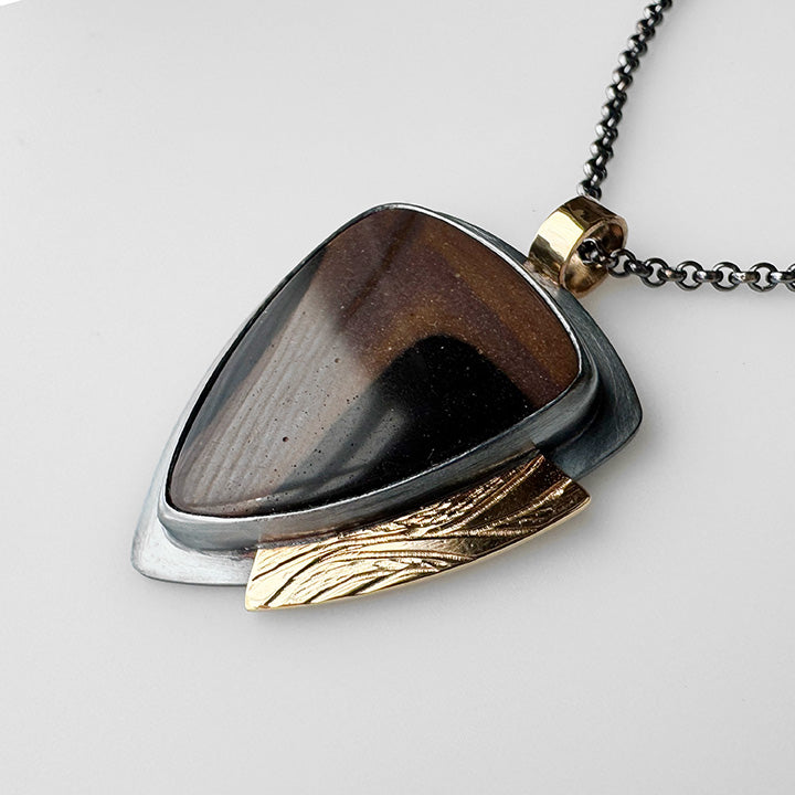 Handmade from sterling silver with an oxidized finish and an Indian Paint Jasper highlighted by a 14k yellow gold bail and motif on the side inspired by the water and winds that eroded the rocks that created this great basin in the Mojave Desert.