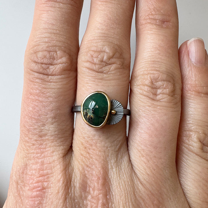 Handmade from sterling silver with a 14k yellow gold bezel wrapped around a deep green kingman turquoise with a gold dot accent finished in a dark patina.