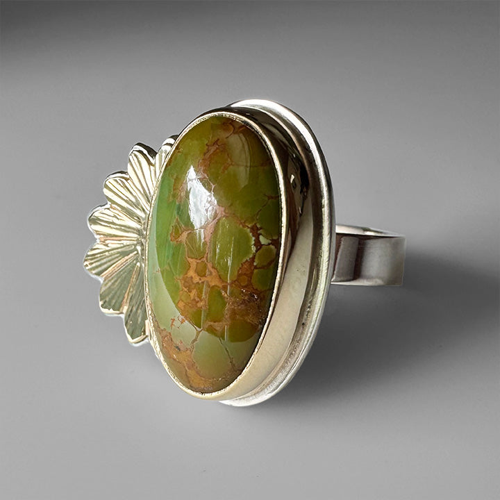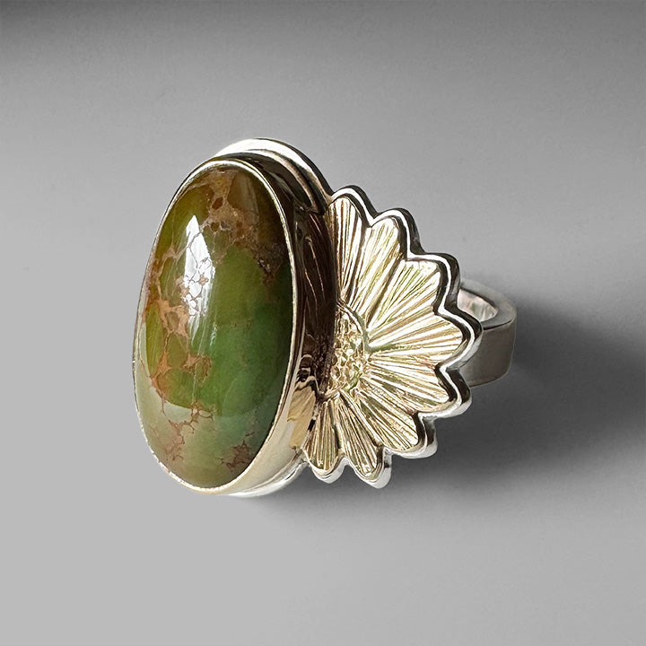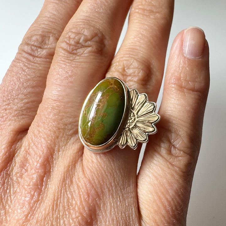 Handmade from sterling silver with a smooth 14k yellow gold bezel wrapped around a green and gold Pilot Mountain Turquoise with a sunflower shaped accent. Sits on a 4mm band.