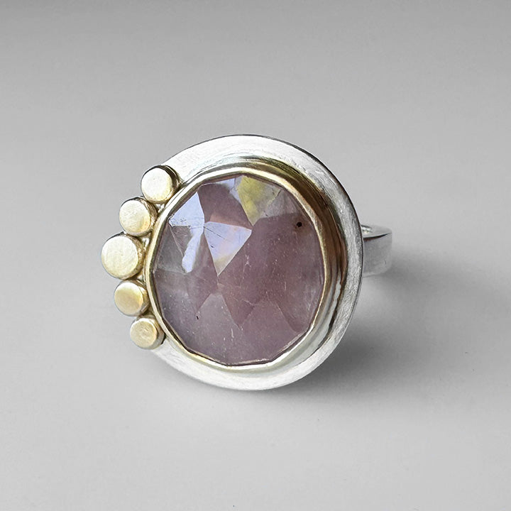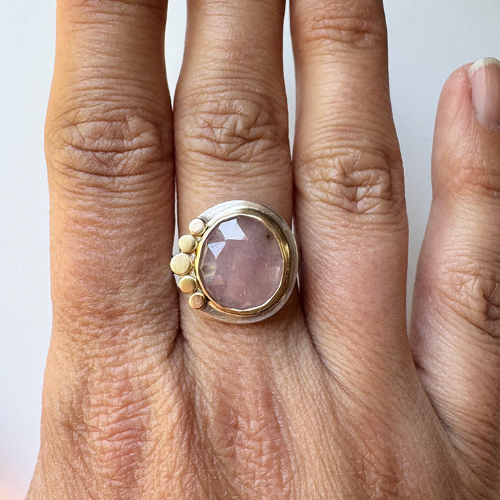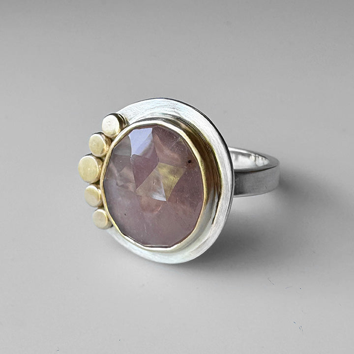 Handmade from sterling silver with a 14k yellow gold bezel wrapped around a soft pink sapphire with gold dot accents.