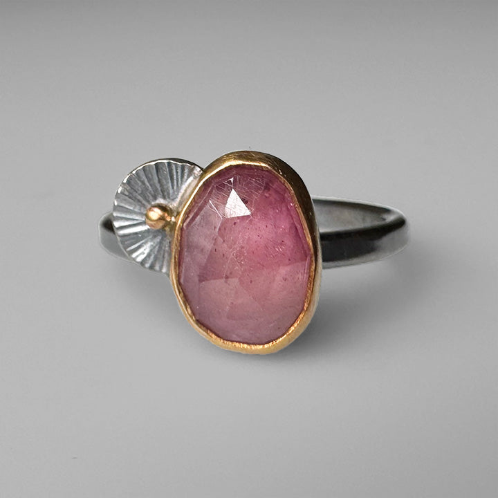 Handmade from sterling silver with a 14k yellow gold bezel wrapped around a sweet pink sapphire with a gold dot accent finished in a dark patina.