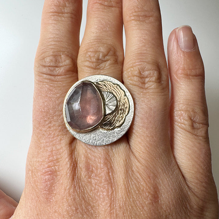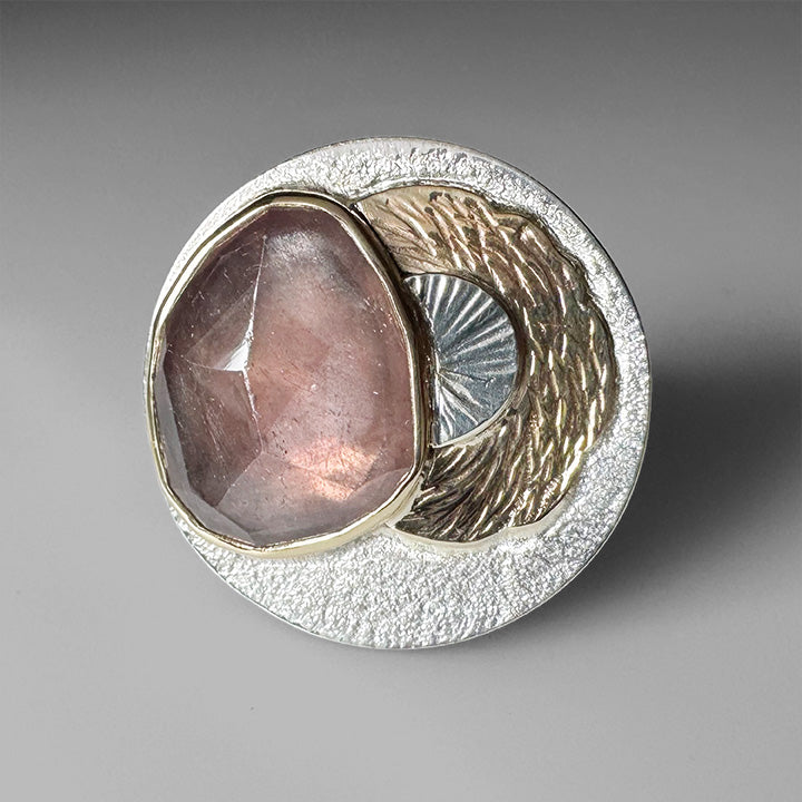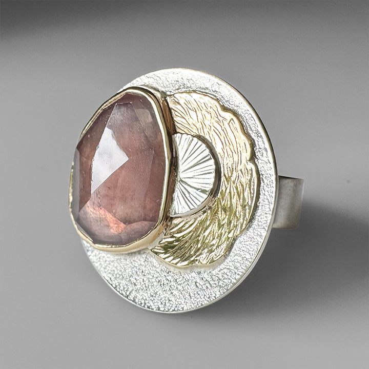 Handmade from sterling silver with a 14k yellow gold bezel wrapped around a big pink sapphire with a ranunculus flower style textured accent. Sits on a 6mm band.