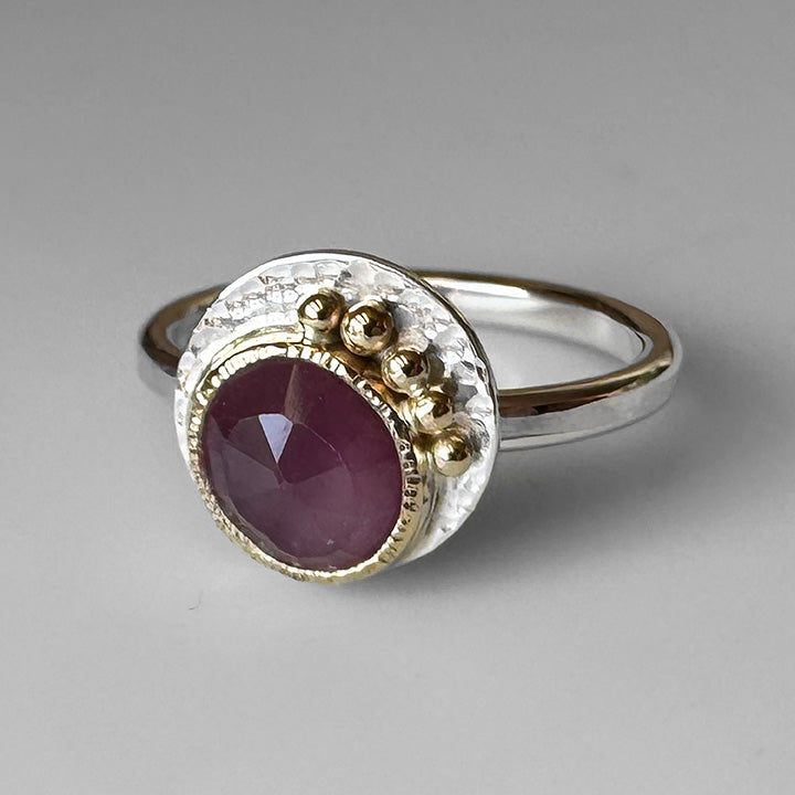 Handmade from sterling silver with a 14k yellow gold bezel wrapped around a deep pink sapphire with gold dot accents on a textured background.