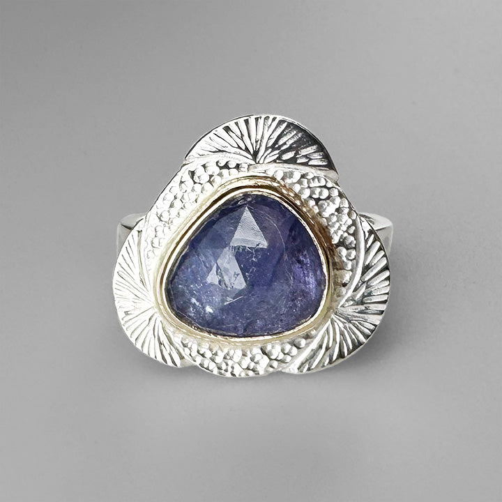 Handmade from sterling silver with a 14k yellow gold bezel wrapped around a lovely blue/purple tanzanite.