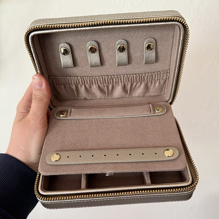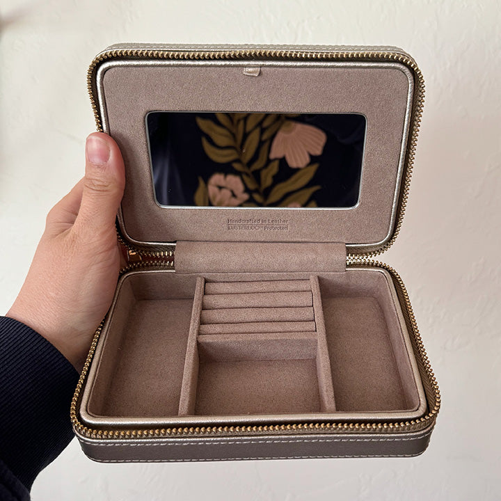 A lovely case inside and out made of rich smooth pewter leather and stunning gold accents. The LutreLoc interior keeps your jewelry from tarnishing and organized. It's the perfect little case for travel or everyday storage.