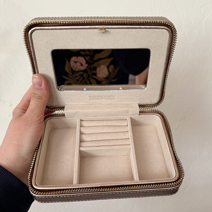 A lovely case inside and out made of rich smooth rose gold leather and stunning gold accents. The LutreLoc interior keeps your jewelry from tarnishing and organized. It's the perfect little case for travel or everyday storage.