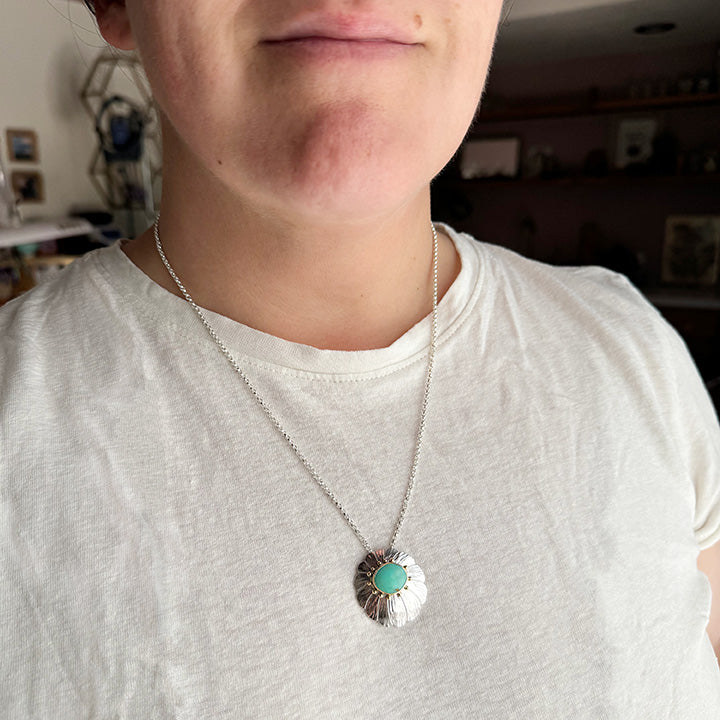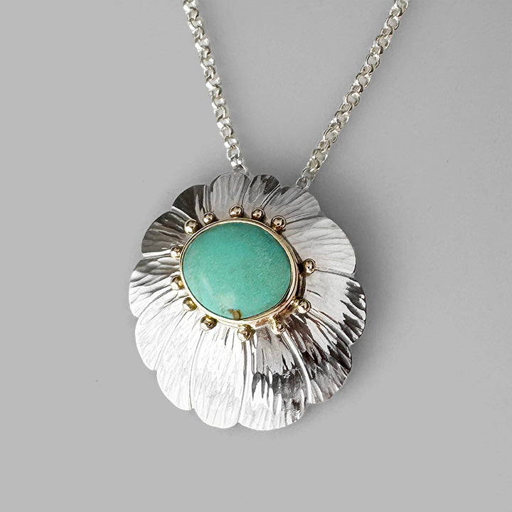 I love this big flower pendant. The shape catches the light in such a pretty way with the warmth of gold and bright pastel turquoise make this necklace pop.